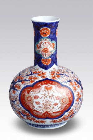 1624年后,中国青花瓷输入日本,伊万里青花中出现了完全仿制明代青花瓷的作品,如户栗美术馆收藏的青花双耳扁壶造型、装饰完全仿制永乐青花扁壶。同时,受明代天启青花和所谓“祥瑞”器的影响,伊万里青花瓷纹样出现了简洁、疏朗或通体装饰两种倾向。青花山水纹钵就具有明显的天启青花山水风格,体外壁以轻佻的笔触,写意的笔法,不事雕琢地描绘出远山、近水,还有那些影影绰绰的小桥、树木、花草、人物、飞鸟,画面空灵悠远,给人以无限遐想。而松冈美术馆收藏的青花凤凰纹八角盖罐可说是通体装饰的典范,上至盖钮,下至底足,花纹布满了整个罐体,腹部饰展翅的凤凰立在岩石上,四周花团锦簇,盖面也绘同样的图案,颈、肩及近底部都饰有连续花纹,画面繁缛华丽,布局密不透风。整器高大端庄,气势宏伟,做工精致,釉色白净,青花发色浓艳,是一件仿中国漳州、汕头等南方出口青花瓷(日本称作吴州染付)的佳作。京烧代表人物永乐保全创作的青花祥瑞手花瓶也明显受到景德镇民窑出口青花瓷“祥瑞瓷”的影响。