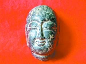 点评内容:这件北齐石雕佛头像高6.5厘米,长宽均为4厘米。石质为黑色大理石,包浆厚重,黑润亮泽,椭圆头型,两耳垂肩,广额丰颊,弯眉鼓目,悬胆长鼻,小口方唇,面带微笑,形象传神。其雕琢细腻,技法娴熟,表现出北齐石雕佛像的典型风格。辟支佛,是辟支迦佛陀(Pratyekabuddha)的简称,为缘觉乘的最高果位。