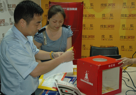 【彭经理】:各位网友大家好,我是冠珠陶瓷广东大区经理彭经理,很荣幸今天能借助搜狐的网络平台与各位消费者和网友们一起见证此次抽奖活动。冠珠陶瓷是新明珠集团旗下的知名陶瓷品牌,在19年的成长历程中逐步被行业认可,更受到了越来越多消费者的喜爱与支持。为答谢广大消费者,冠珠陶瓷携手全国经销商开展感恩促销活动,7月30日至8月1日活动在广西火热进行,大家可以看看这就是活动当天店里的促销现场,非常火爆,仅3天广西的成交量就达两千多户。活动中惊喜不断:有进店送礼、新品买三送一等为消费者实实在在省钱的促销内容,其中一项就是今天即将在这里进行的钻戒抽奖活动。今天的抽奖仪式将现场抽出5名钻戒中奖者。只要你参与了我们的活动,就有机会得到一张抽奖券,各地经销商再将抽奖券快递到佛山冠珠陶瓷总部。