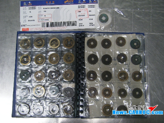 民航资源网2011年8月9日消息:8月9日11时,青岛流亭国际机场(简称“青岛机场”)查处一名韩国籍旅客在行李中私藏夹带中国文物,截获大量燕明古钱币及陶器、字画等珍贵文物。