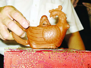 在南博,来自台湾成阳艺术文化基金会的宋信德先生小心地从一个锦盒中取出一件小巧的紫砂壶,壶盖上像有个鸡头的造型,他说这把壶称作“凤凰壶”,壶身雕刻了祥云托珠的造型。宋先生说,1721年德国德里斯顿博物馆的登记册中能找到与之相同的壶,证明是康熙年间造的。他又拿出另一件镂空的“梅花纹紫砂圆壶”说,欧洲人有在高档工艺品上镶金属的习俗,这把镂空梅花纹紫砂壶的壶嘴、壶纽和座子上都加镶了金饰,纽的金饰为梅花形,使紫砂壶在典雅中透出华丽,既美观又耐用。这批展品都是从海外的大型拍卖会上重金购得的。