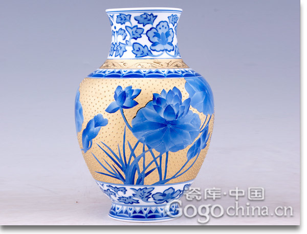 图:高档瓷器袁述凡手绘青花描金荷花溜肩瓶