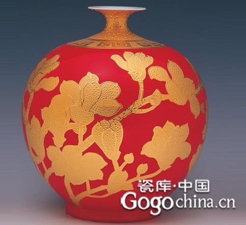 图:中国红金玉满堂描金陶瓷艺术花瓶