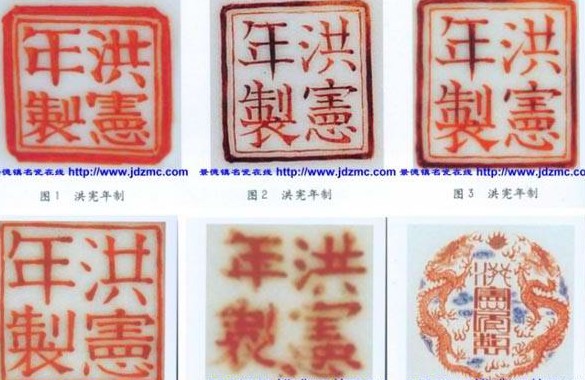 年号款始于明永乐,终于民国。款式几经变化,延续了500余年。民国时期的年号款仅见有“洪宪年制”、“洪宪御制”两种。此年号正式使用于1916年元月1日至3月23日,总计83天,若从1915年12月12日袁世凯改国号为“中华帝国”,以次年为“洪宪”元年来讲,此年号存在了110天。但此款识给后人留下了很大的谜团。有学者认为均为仿款,有学者认为“洪宪年制”有少数真款。“洪宪御制”均为仿款。但至今仍无一件极具说服力的洪宪瓷器。而从大量此款识的器物来看,民国时期不论高中低档瓷器,均以书此款为时尚,故真假难辨亦在情理之中。