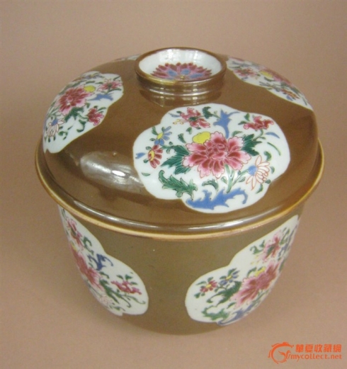 清雍正 超大号酱釉开光粉彩花卉大盖盆