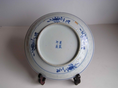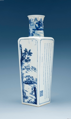 康熙(1662—1722)朝时间跨度长,器物类型丰富,工艺水平高超。此期使用浙料和珠明料,青花发色前期较灰暗,中期以后青幽翠蓝、明快亮丽。画法早期以单线平涂为主,气势粗犷;中期以后则勾勒、渲染、皴法等并用,绘画精细,并以青花色阶(即所谓“青花五彩”)而备受推崇。纹饰题材多样,有山水人物、龙凤花鸟、鱼虫走兽、诗文、博古等,其中最具时代特点的是冰梅、耕织图、刀马人、双犄牡丹等。图案留白边较其他朝明显。胎致密细白,呈糯米糕状。釉硬,与胎结合紧密,见桔皮或棕眼,早期白中闪青,中期以后亮白。器型除日用器外,观赏瓷大量增多,典型器有盖罐、凤尾尊、花觚、象腿瓶、笔筒等。器物的底足也有极强的时代特征:琢器多二层台底;笔筒多玉璧底;圈足早期的多是两边斜削的较尖的“鲫鱼背”底,中期以后基本上是圆润的“泥鳅背”底;大盘类多双圈底,这种底从明末和顺治时出现,流行至康熙中期。款识种类多样,早期多用干支款,年款多用楷书,中期以后各种堂名款、图记款、花押款流行,并流行至雍正。仿款、伪托款也较多见,尤其以仿嘉靖款居多。