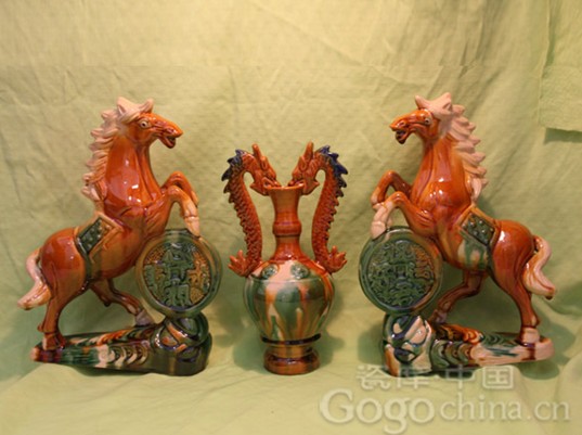 唐三彩是在洛阳邙山的唐代墓葬中发现的一种陪葬的冥器。自其出土时起就成了全世界瞩目的焦点。唐三彩工艺礼品的辉煌在唐代贵族的陪葬典制中就可见一斑,现在国际上最为受欢迎的唐三彩工艺品为三彩马,其中又以白三彩和黑三彩为最名贵。