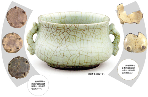 这几个文献均提到杭州,其中王士性和高濂还提到了凤凰山,说哥窑与修内司官窑俱取土于凤凰山下。照此分析,想必哥窑的烧造地点相距凤凰山也不会太远吧!1996年,杭州凤凰山下老虎洞南宋窑址的发现解决了困扰学术界几十年的“修内司官窑”谜团。不仅如此,老虎洞窑址的元代地层出土了大量带“八思巴文”的窑具以及与传世哥窑相似的一类器物。据八思巴文专家翻译,窑具上有“章(或张)记”的铭文,这自然使人联想到章生一的传说。上海硅酸盐研究所对元代地层的瓷片进行科学测定,结果表明其化学成分和显微结构与传世哥窑比较接近,他们据此认为所谓传世哥窑就是在老虎洞元代时烧造的制品。