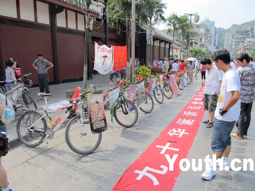 8月2日晚,伴随着火车的汽笛声,景德镇陶瓷学院风火轮自行车协会暑期“三下乡”社会实践的十名大学生踏上了回家的火车。此次社会实践主要是以建党90周年为契机,结合专业及社团优势,队员们开展了“宣传红色江西,弘扬陶瓷文化”宣传考察活动。车队从英雄城南昌出发,沿着革命先辈们的红色足迹,途经井冈山,横跨湖南省,最终抵达贵州遵义,行程1600多公里,共历时22天。