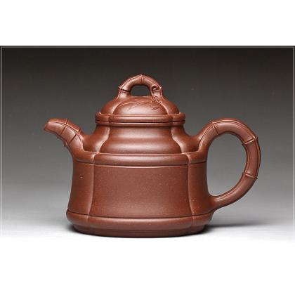 上图所展示的这款同样由朱峰创作的紫砂壶整器施艺严谨细致,注重细节,壶把壶盖壶身相辅相成,是难得的竹子造型的壶。据博宝艺术网的专家介绍说,明清的紫砂壶在造型方面有了很大的突破,极大地丰富了我国的紫砂壶的形式和内涵。紫砂壶发展到今时今日,呈现出一派繁荣的景象,但是,也面临着传统手艺的失传等问题。收藏紫砂壶无疑也是对紫砂壶的拯救做出贡献。