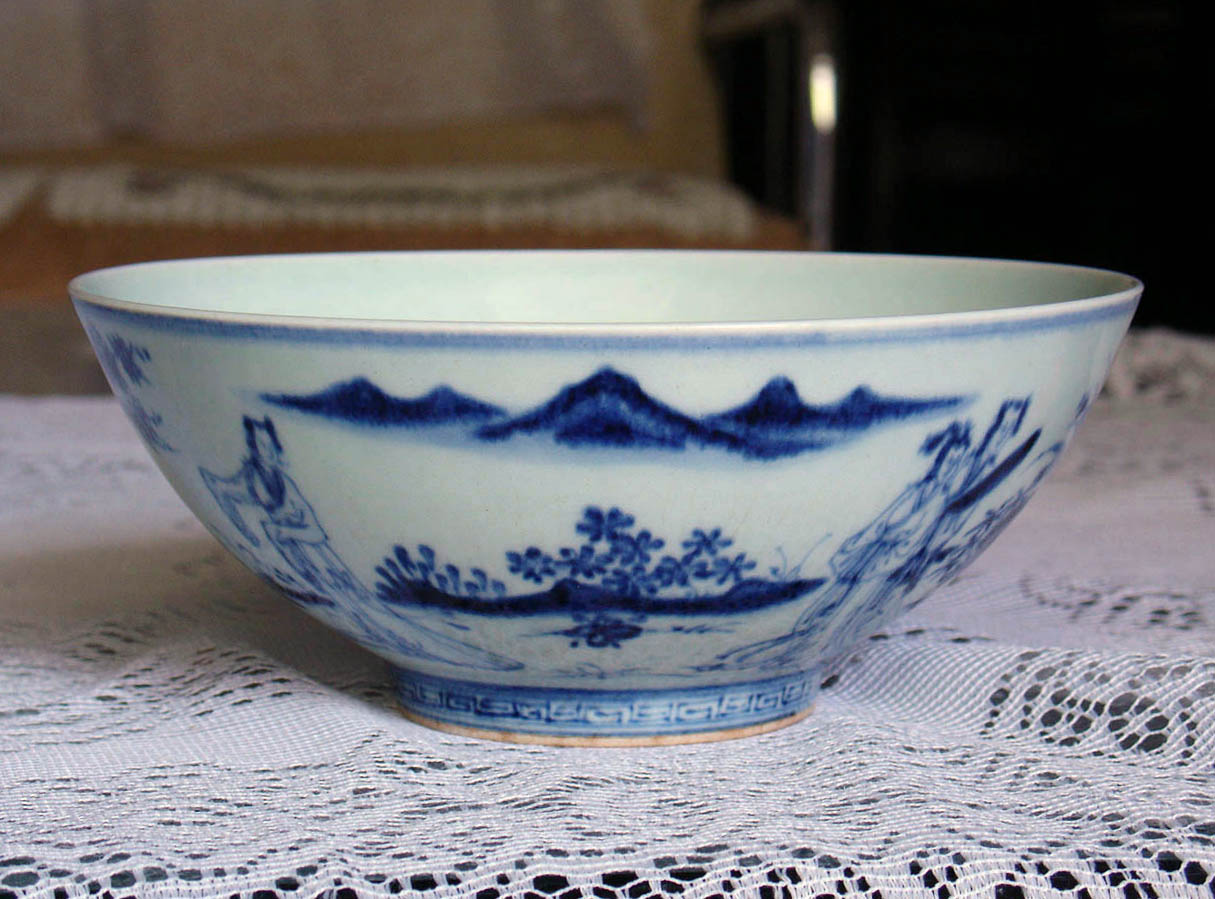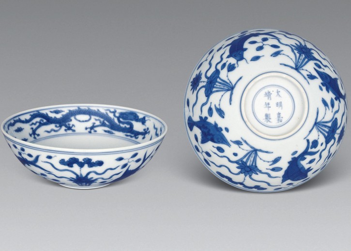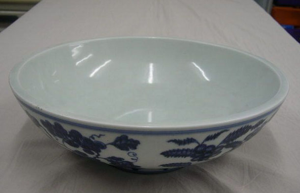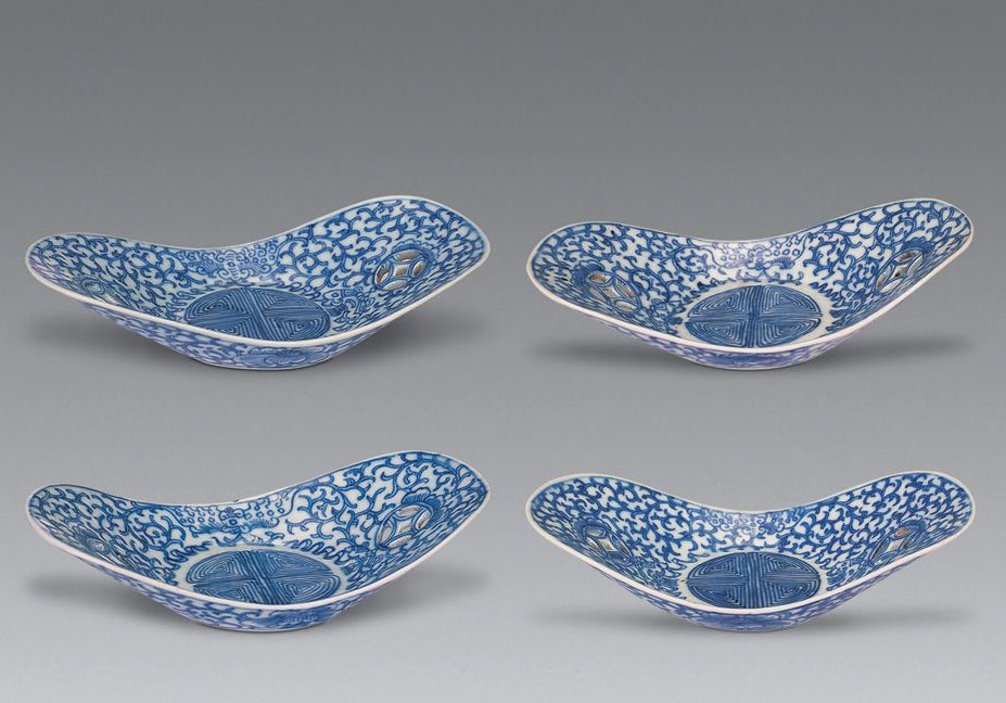 骰子碗:俗称“骰盔子”,因与旧时赌博用具相似而得名。明宣德时期景德镇烧制。器型为平沿敞口、浅弧腹、圈足,胎体厚重,器内素白,器外多为青花或洒蓝釉装饰。
