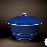 盉碗:也称“合碗”,明宣德时景德镇窑已有烧制。器型为撇口、直壁、折腹,下腹部有两道凸起的弦纹为饰,上覆圆顶盖,清代盉碗盖钮多作蹲兽式。