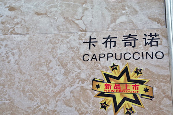 首先小陶从店家“偷”出来两块卡布奇诺,把它们放在桌子上。鉴于它们很重,小陶走了两遭才搞定。卡布奇诺的纹理清晰自然,小陶用手一摸,感觉有一些凹凸感,就像真的大理石一样。
