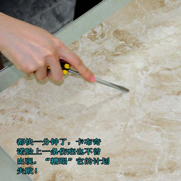 毫无疑问,这是小陶最喜欢的一项测试。拿着螺丝刀肆意“糟蹋”完美的艺术品,每次都让小陶很期待。可这次小陶遇到了敌手。小陶狠命地来回划半天了,预想中的大花脸仍然没有出现,卡布奇诺脸上一条伤疤也不曾出现。小陶只得放弃,憧憬下一项测试能把它推下神坛吧。
