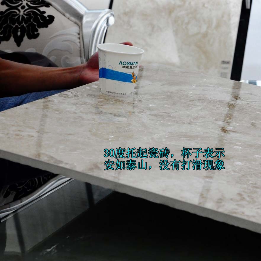 作为大部分瓷砖测评的必备测试,可以看出瓷砖吸水率大小的重要性。作为一块地砖,如果吸水率高的话,必然会引起膨胀变形,大大影响家居的美观和一体性。小陶把水倒在瓷砖上就在店里瞎逛,五分钟后回到桌子旁,发现瓷砖几乎没有吸水。
