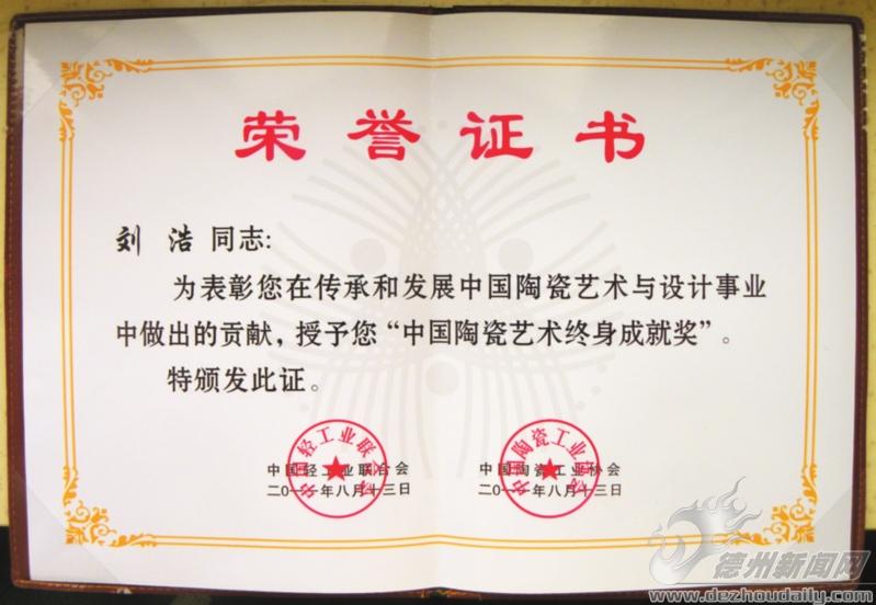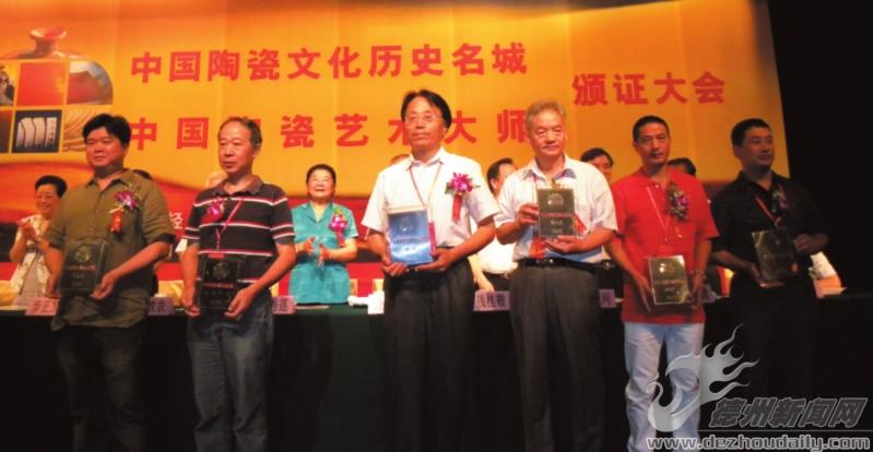 8月13日,由中国轻工业联合会、中国陶瓷工业协会联合举办的“中国陶瓷文化历史名城和中国陶瓷艺术大师颁证大会”在北京钓鱼台国宾馆举行。会上颁发了“中国陶瓷文化历史名城”、第二届“陶瓷艺术大师”以及“中国陶瓷艺术终身成就奖、特别贡献奖”奖项。国家领导人周铁农、顾秀莲等为获奖者颁奖。我市著名陶艺大师刘浩先生获得“中国陶瓷艺术终身成就奖”荣誉称号。
