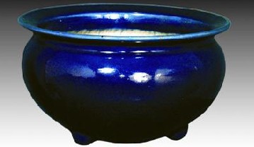 图1、康熙景德镇祭蓝釉乳足炉:器型为唇口外侈,束颈,鼓圆腹,下承半圆状三乳足,口径25.3厘米,高14.6厘米,足距9.3厘米,炉内施白釉,炉外施高温钴蓝釉,釉面晶莹剔透,像蓝宝石一般,浓艳可人。仔细观察,在釉面下聚集小气泡遍布通体;底足露胎处,胎釉结合紧密,胎质纯净细腻,如同糯米粉一般细白,但又不失坚致细密,胎体显得较为厚重,整体造型古拙,凝重而质朴,此炉经过三百年时间,釉色乃保持着明亮清澈而不失深沉含蓄,器型完整无缺,实为一件不可多得的康熙民间佳器。