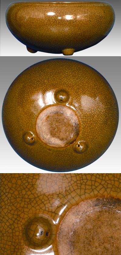 图2、雍正景德镇窑茶叶末哥釉乳足炉:器型为敛口圆弧腹渐收,底承半圆状三乳足,口径24厘米,腹径27.6厘米,高12.8厘米,足距10.2厘米,内外施鳝鱼黄茶叶末釉,釉色黄中泛绿似鳝鱼皮,釉面匀净肥厚、失透,起桔皮似的皱纹,并显现出油腻酥光似的古旧腻光,通体片纹交织,粗纹呈墨色,纹路长纵横全炉。细纹开片较短,显浅红色,形如冰裂状,十分光润,精美异常。外底无釉,隐约有旋纹,足端三乳足浑圆饱满,器口施一圈酱黄釉,以示“紫口铁足”。此炉造型淳朴、制作规整、釉色古雅,实属雍正厂官釉之上品。