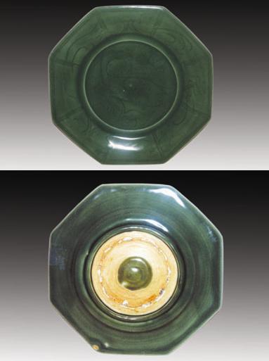八角形大盘是元代龙泉窑的独特造型,仔细品赏,这种八角形实则是代表莲瓣,它宛如一朵盛开的莲花,有棱有角,别具韵味。在翠绿的釉下莲花盛开,鱼儿戏游,赋予一种绿水莲香鱼儿肥的诗情画意。造型与纹饰形成完美的和谐,传递出一种高雅的审美情趣。此盘釉层肥厚,为多次施釉,故釉色青翠欲滴,有玉质之感,它继承了南宋龙泉梅子青多次施釉的工艺传统,达到较为理想的效果,如此美丽的梅子青釉在元龙泉中亦不多见。其外底露胎垫烧,中间有凸起的釉斑,则为元代烧制工艺的鲜明特征,综观此器当为元代龙泉窑鼎盛时期的一件精美之作。