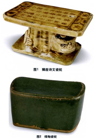 在北京首都博物馆开幕的中国记忆——五千年文明瑰宝展中有一件唐代长沙窑褐绿彩绘狮座诗文瓷枕(图1)非常引人注目,它造型别致、装饰精美、器形小巧,为长沙窑瓷枕中之极品。高7.3、长13.1、宽8.1厘米。青釉、灰白胎,枕面与底座均为长方形,中一卧狮承托枕面。枕面为长方八角,两端是褐绿彩六边几何图案装饰,中间部分用褐彩书写七言绝句一首:“日红衫子合罗裙,尽日看花不厌春。欲向窗台重注口,无那萧郎恼煞人。”枕头是人们生活中的必需品,它能使人们在就寝时头部舒适、从而使大脑得到更好的休息。南方夏季天气炎热,高温持续时间长,寝具以凉爽为宜。于是季节性商品瓷枕就出现于人们的生活之中。在一件宋代瓷枕上有这样的诗句为证:“久夏天难暮,纱幮正午时,忘机堪昼夜,一枕最幽宜。”