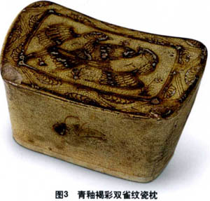 据不完全统计,现已发现长沙窑瓷枕百余件,保存完整的仅有数十件,它们主要是长沙窑窑址、湖南地区以及扬州、宁波等地唐五代墓葬或遗址出土。这些瓷枕的装饰题材和装饰手法相当丰富,从彩釉上看,褐绿彩呈色纯正鲜艳,青、白、黄、绿等颜色釉齐全。如湖南省博物馆收藏的绿釉瓷枕(图2),釉质匀润、釉色纯正,为颜色釉的代表之作。长沙窑瓷枕的装饰手法有绘画、印花、刻划等多种,装饰题材不拘一格,画面很少雷同,诗词、写意画耐人寻味,飞禽走兽、植物等也活现于瓷枕之上。中国传统绘画讲究团团圆圆,成双成对,长沙窑瓷枕装饰也不例外,如瓷枕(图3)上所绘比翼双飞的雀鸟,前面一只回首顾盼,后面一只紧紧跟随,两雀双目传情,画面栩栩如生。由于瓷枕是季节性商品,故在装饰上反映季节性内容也较多,有盛开的莲花、有芦丛中的水鸟,特别是湖南省博物馆收藏有两件长沙窑五代的纪年瓷枕,一件是“开平三年—夏月二女使用”,另一件“贞明六年”瓷枕的胎上刻划的时间是“五月十五”,而枕面用褐彩书写的时间却为“六月六日”,很显然,底款是在瓷枕坯胎未干时刻划上去的,五六月正是南方的盛夏季节,也是瓷枕销路最好的时段。
