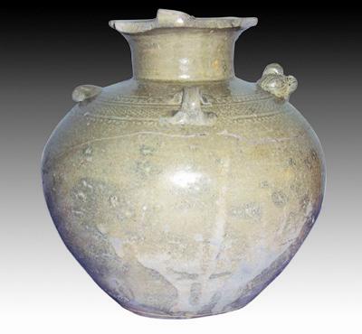 今年“五一”节,笔者早早就赶到了南京朝天宫古玩市场,发现有一个摊主卖的基本都是高古瓷器,有晋瓷、宋瓷,有整有破。只见一个买主正在和卖家为一只东晋四系罐讨价还价。我眼睛一闪,摊上一只好像西晋盘口鸡首壶的残件立刻跃入眼帘,造型古朴。见买家和卖家依然激烈地讨价还价,旁边人都在看着这两个人,我这时蹲下来,从人缝中把那只破鸡壶从里面给钩了出来。上手细看,一只典型的西晋盘口鸡首壶(见图),用手一量约高28cm,此壶残缺盘口,圆腹如球形,腹身带有一条连结鸡首、鸡尾及双系的装饰带,宽约2厘米,遍布压印的斜方格纹和两圈太阳花。胎骨灰白,釉色偏黄,吃土较重,施釉到底,罐底有明显的支烧火石红痕迹。罐身正面塑贴一个母鸡头,正作张口鸣叫之态,在与鸡头相对的另一端塑出鸡尾,罐自然成为鸡身状。此刻我心中大乐,询问价钱,卖家也顾不得与我讨价还价,我最终以不高的价钱将之拿下,收入囊中,继续逛其他地摊去了。