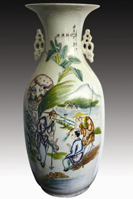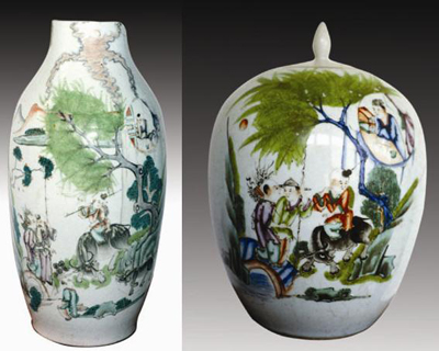 图2、图3:二者均为民国景德镇生产的粉彩瓷器。图2为花瓶(残),剩高50厘米,底径16厘米。图3为深腹罐,高30厘米,底径13厘米。图2色彩宁静淡雅,图3色彩明快艳丽。两者画面大体相同:渔翁(图2)、渔郎(图3)垂钓归来在树阴下的小石桥上碰到砍柴负薪归来的樵夫,于是两人相视而语,牧牛童子肩扛竹鞭,骑在牛背上悠哉行来,引得高楼寒窗苦读的童子(图2)、书生(图3)好生羡慕,起身俯视啧啧赞叹……