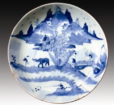 图1:光绪青花“渔樵耕读”瓷盘,该瓷盘产于景德镇,直径24厘米,胎瓷洁白、青花发色纯正淡雅,一幅中国传统的写意山水“渔樵耕读”图跃然眼前。渔夫在河边静坐垂钓,樵夫担着两捆柴禾吃力地在石拱桥上蹒跚行走,犁田归来的耕夫牵着翘首摆尾的水牛缓缓而行,树下屋中的书生,低头弓腰苦读之乎者也……