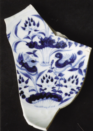 这只元代“至正型”青花瓷片长15.6厘米,宽10.3厘米,高4.4厘米,足径7.7厘米。