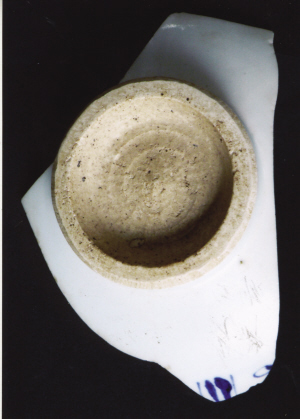 胎质:坚硬、厚足墙、足底及内为沙底略显淡黄色,并带有少量黑褐色沙粒,旋痕乳丁有明显凸状,残片裂面有细小缝隙孔。