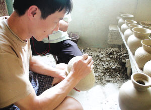 村民邱和生在陶胚上雕刻花纹,他的手艺是从父亲那儿学来的。