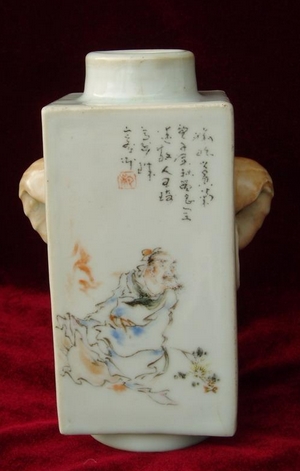 王琦 (1886--1933)为“珠山八友”之首,字碧珍,别号陶迷道人。祖籍安徽,后迁居江西新建县。王琦幼年曾读私塾,酷爱绘画。父亲是贩盐船户,曾随父在水上生活。王琦摆脱了钱的影响,转师为乾隆间的“扬州八怪”的黄慎。模仿黄慎写意法画衣纹,线条自由生动,运用粉彩画人物脸面、有立体感、富有新意。王琦用笔豪放、富于变化,所绘花鸟鱼虫各具特色。