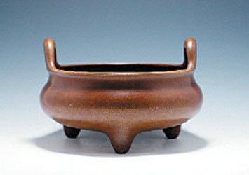 宣德炉的特征是铜质优良,造型古朴典雅,制作精细,纹饰精致,工艺精湛。行家介绍说,器款在外底正中,为刀刻阳文楷书“大明宣德年制”六字,书法近似欧体,器款的“德”字心上省略一横。这种“德”字心上一横被省略的写法始于汉代,汉碑、魏碑中的“德”字心上普遍省略一横。唐代书法字帖的“德”字写法既有省略一横,也有保留一横,如欧阳询字帖的写法省略一横,颜真卿、柳公权字帖的写法则保留一横。元代赵孟頫字帖的“德”字写法也省略一横,明代继续流行这种写法。现在传世的“大明宣德年制”六字楷书款的铜香炉很多,最常见的是桥耳钝锥足圆形炉,它既有明代的仿品,也有清代的仿品。底款“大明宣德年制”的“德”字心上省略一横的铜香炉是明代铸造,保留一横者则多数是清代所铸。