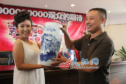 为了充分诠释作品所体现的红歌精神,余欣还先后两次登上井冈山写生,最后选定玉兰瓶作为器型,采用纯手工制成,胎体釉料精选细腻,由下向上渐渐扩展,意为积极向上发展。当看到红歌三甲捧着纪念品时,余欣非常激动,他表示自己终于与红歌结缘了。