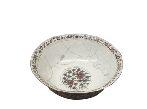 同样为明代洪武年制的釉里红地白缠枝莲纹大碗,外壁纹饰以釉里红为地,留出白的缠枝莲花八朵,碗心双圈内绘折枝牡丹。虽然出土物中此类碗仅有几件,亦不见有传世品。