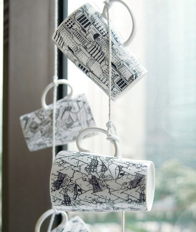 涂鸦图案风格的瓷质水杯,主题风格鲜明,年轻的瓷器控超级喜爱。一次购买多个图案的杯子,用结实的尼龙绳把杯子一个个地穿起来,绑牢固,悬挂在窗前,就变成一串风格独具的大号风铃,个性又带有画家风格。