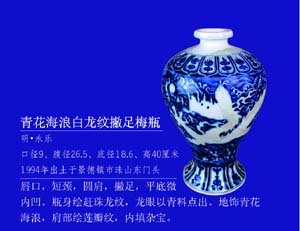 1994年出土于珠山:唇口、短颈、圆肩、撇足。平底微内凹,瓶身刻戏珠五爪龙,地饰青花海浪,龙眼以青料点出,肩部绘莲瓣纹内填杂宝,撇足绘莲瓣纹,内填莲花。该梅瓶青料浓艳,多有黑褐色斑块。