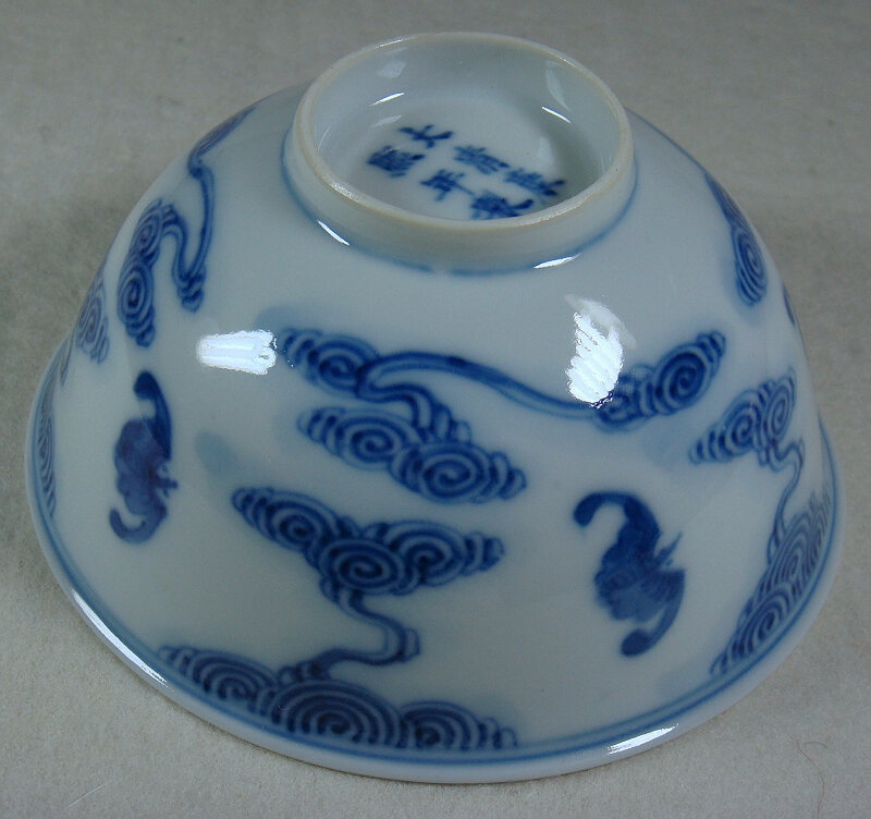 道光(1821—1850)、咸丰(1851—1861)、同治(1862—1874)时期的器物大体相近:青花发色飘浮,胎质粗松,釉稀薄,胎釉结合不紧密,纹饰以吉祥图案为主。