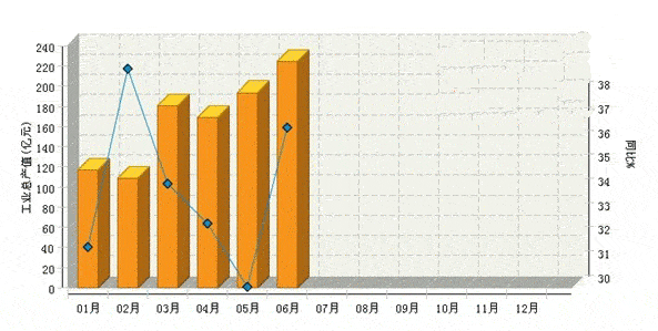 上半年各月同比增速均保持在三成以上。2月份受春节假期因素影响,当月完成工业总产值108.17亿元,为上半年单月最低值,但39.07%的同比增速,为单月峰值;3月份起同比增速连续三个月逐月下降,至5月份30.04%的同比增速为上半年最低;4月份工业总产值出现阶段性回落,比上月减少11.54亿元;5月份起工业总产值逐月提升,6月完成工业总产值224.32亿元,为上半年单月峰值,同比增长36.61%,增速回升(见图2)。