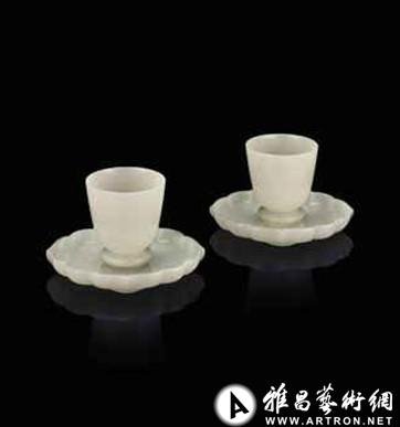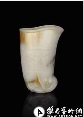 时至十八世纪,好古慕雅之风在清廷经久不衰。康雍干三朝盛世,君主皆汲汲于搜求古董文玩,对于用当代材质制成的仿古器物,他们亦青睐有加。拍品中有一对让人赞叹不已的白玉杯配花菱形盏托 (拍品1021号),其钟型杯身光素无纹,乍看之下,似乎与仿古器物毫无关联。其实,其托盘精致的菱式造型,可上溯至汉代漆器及年代略晚的金银器。众多精品中,尚有一件较为明显的仿古之作,即珍罕之至的黄玉仿古觥 (拍品1017号)。玉匠采用了上乘的黄色美玉,并师法青铜器形,将之琢成古意盎然的玉觥。工匠已尽量避免在器身浮雕纹饰,藉以突显石材的天然色泽。觥身唯一的装饰是其精美的仿古卷草形柄,下承小巧玲珑的仿古凤凰,其盖顶的卷草纹装饰衬以螭龙。白玉仿犀角饕餮纹杯 (拍品1018号) 亦属仿古器物,其构思之妙让人叹为观止。此杯形制敦硕,雕琢细腻,器身下半部状似枝叶繁茂的卷草,造型俨若盏托。杯身大体光素,仅在器腰浅雕饕餮纹一匝。总的来说,此杯糅合了仿古器物的两大特征:其形制脱胎于古代角雕,而饕餮纹饰则是师法古青铜器。