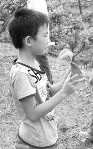 10岁的陈与时拿着一片青瓷,聆听工作人员讲述。