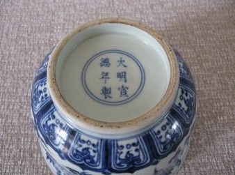 明代官窑瓷器纪年款以朝代款(又称年号款、年款)为主,民窑瓷器纪年款则以干支款较为多见。明代纪年款多以青花料书写,兼用暗刻、模印、釉上彩和白泥料书写。落款位置以器物外底最为多见。也有在器内底、近口沿、颈、肩、腹、流、柄等处的。多见的是在瓷盘、花瓶、茶具底部。官窑年款字体除永乐、宣德、弘治、万历朝有篆书体外,其他朝未见。款字排列方式,以六字双行和四字双行最为多见,六字三行、一排横书、一行直书、六字环形、四字钱文排列等极少见。官窑年款多由宫廷出样、御窑厂有专人负责照样书写,字体严谨规整。民窑纪年款则大抵随意书写,字体多草率不规。据有关专家考证,明代景德镇官窑瓷器的生产始自洪武二年()369年)。止于万历三十六年(1608年),此期间官窑瓷器上的纪年款以宣德、成化、弘治、正德、嘉靖、隆庆、万历较多见,其他朝则少见。有人根据明代各朝官窑瓷器上年款的特点,将明代官窑瓷器年款总结为五句口诀,即“宣德款多,成化款肥,弘治款秀,正德款恭、嘉靖款杂”,这与实际情况基本符合。