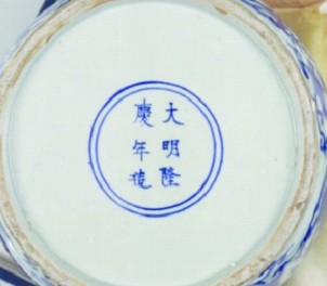 在瓷器的底部或其它部位,往往有表明年代,窑名,人名,堂名,或者表示赞颂,祝愿等内容的文字,也有的器底或器里有某种识别性的图案,这些统称为“款识”。一般说来,款识是瓷器装饰的附属物,好的款识与装饰画面相配,可以增强器物的艺术性。款识表达的内容可分为:纪年款,堂名款,陶人款,吉言款,赞颂款,花样款等六大类。按书写部位分,主要有底里铭和额铭。将款字写于器物底部的称底里铭,由于款识的内容,格式,字体,书法各方面都具有鲜明的时代特征,所以它对瓷器的断代,断定窑口和辨别真伪都有重要作用。