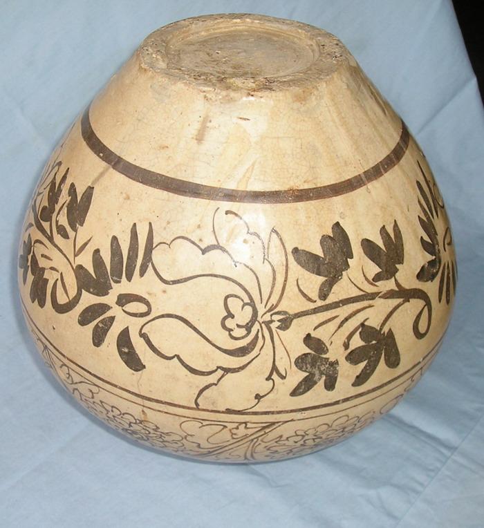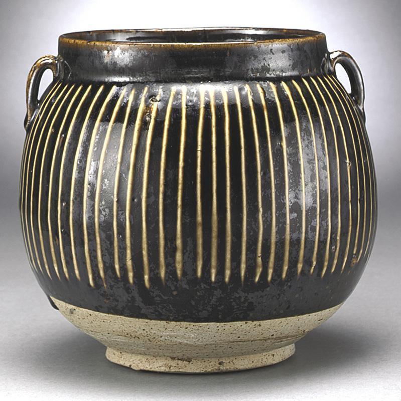 黑瓷也是磁州窑产品的大宗,这类产品的造型以罐、碗、瓶为主,也有盘、壶和玩具。胎质粗糙,胎色黄褐,胎体厚重,釉层较厚,黑色纯正。大多数器物是里施满釉、外施半釉,也有些里外均施半釉,有些罐类内壁施釉仅过口沿。黑釉碗除纯黑者外,还有一些油滴、兔毫、玳瑁斑等窑变装饰。绿瓷产量不大,大都是金代产品,主要造型有盆、盘、花瓶、酒瓶等。