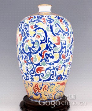 图:袁述凡手绘釉下五彩仿古纹饰鼓圆袖口精品花瓶