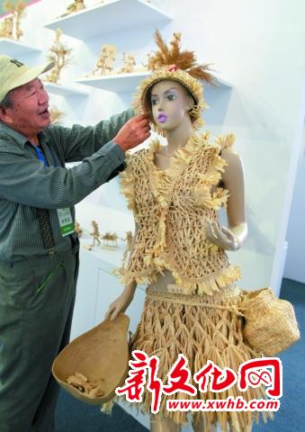瓷器展位东侧,一位身穿草编舞蹈服的树脂模特做起了迎宾员,这里就是草编展位。