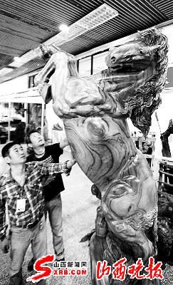 山西晋商收藏博览会上,樟木雕塑《立马成功》吸引众人观看。