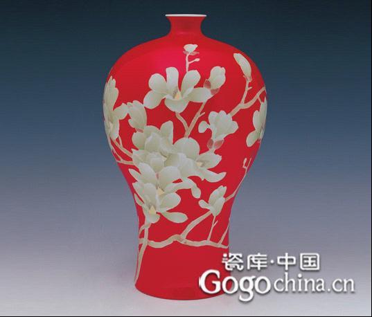 图:红瓷手绘玉兰缤纷梅瓶陶瓷艺术花瓶