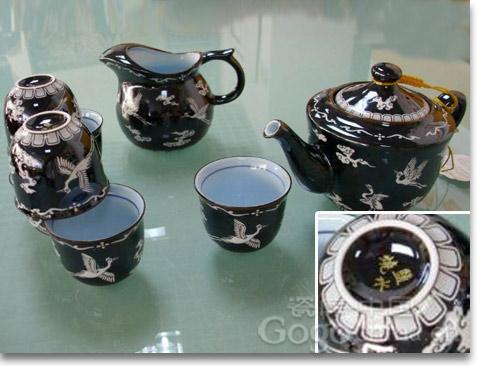 图:台湾盐水烧新品天目黑釉白祥鶴纹8头高档功夫茶具