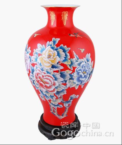 图:富贵牡丹花开红瓷侍女花瓶